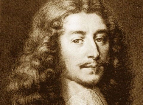 Rochefoucauld was born in Paris in 1613: the son of a wealthy, famous aristocrat. He was married at 14, had most of his eight kids within twelve years, and got Louis XIV's cousin, the Duchesse de Longueville, pregnant out of wedlock. It was said by women close to him that he'd never been in love, and his maxims seem to agree. He writes in his own book, there are good marriages, but no rapturous ones, and the thing missing in love affairs is love — two statements which cover all the bases*.